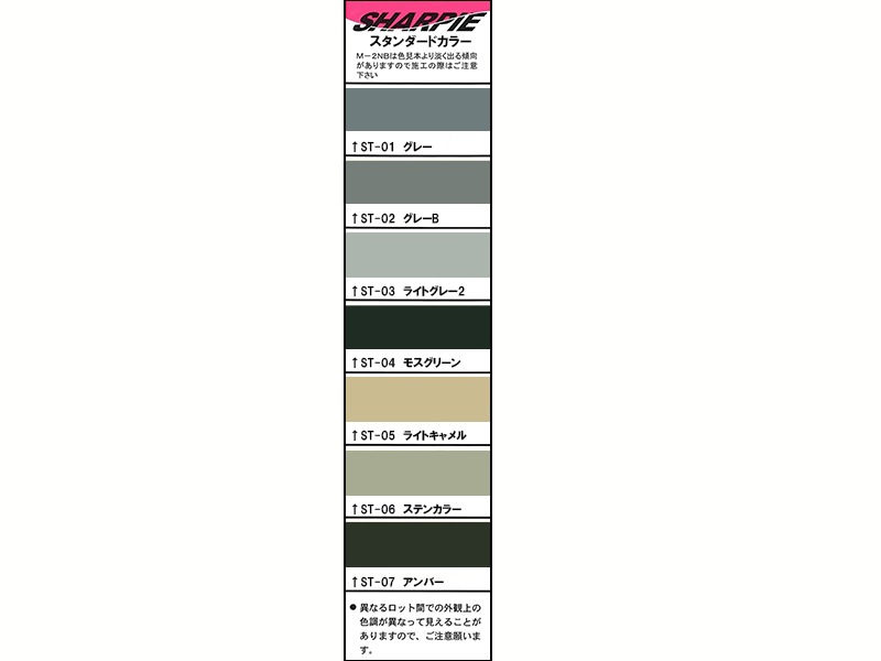 ●色(スタンダードカラー):グレー(ST-01)、グレーB(ST-02)、ライトグレー2(ST-03)、モスグリーン(ST-04)、ライトキャメル(ST-05)、ステンカラー(ST-06)、アンバー(ST-07)
