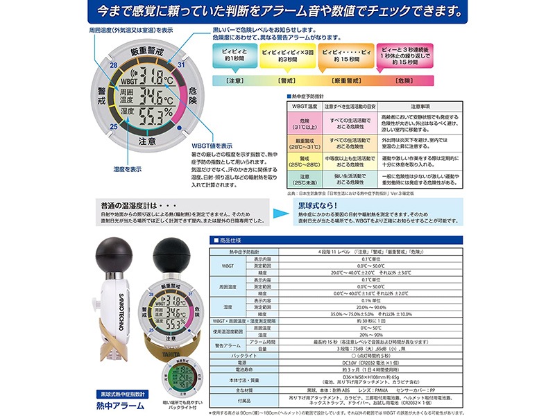 ●熱中症予防指針をアラーム音と数値でお知らせ。●黒球式だから、日射や輻射熱も測定。
