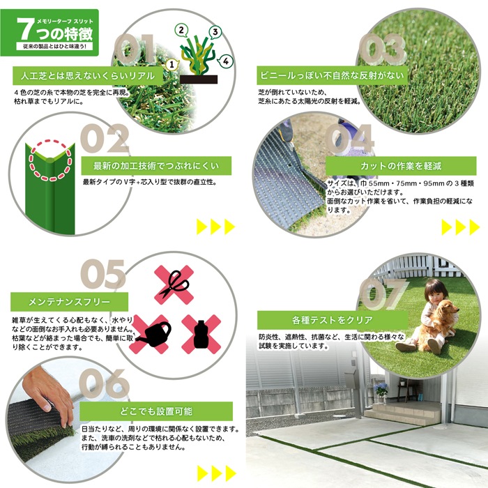 ①【カット作業を軽減】サイズは巾55mm・75mm・95mmの3種類をラインアップ。面倒なカットの作業を省いて、作業負担の軽減になります。②【メンテナンスフリー】雑草が生えてくる心配もなく、水やりなどの面倒なお手入れも必要ありません。