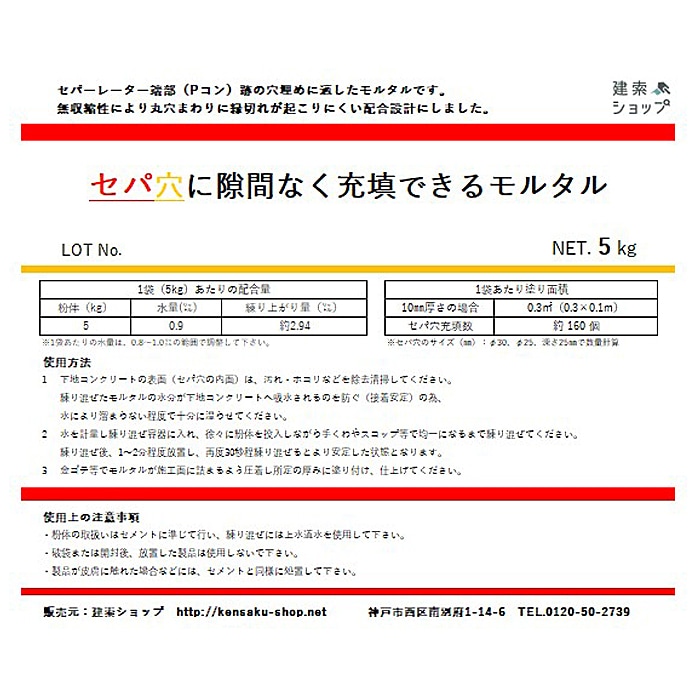 - 【受注生産品】セパ穴に隙間なく充填できるモルタル 5kg
