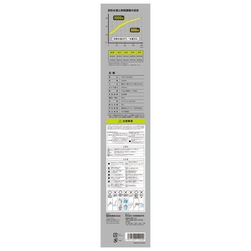 風呂の過熱用には使用しないでください。空焚きはしないでください。最低水位以下で使用しないでください。樹脂製容器では使用しないでください。使用中及び使用後はヒーターに触らないでください。また可燃物の上に置かないでください。使用中は目を離さないでください。