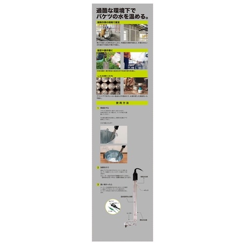 在庫・納期など、商品についてのお問い合わせはこちら内装・土木建築現場、アウトドアレジャー等で、バケツの水を温める電熱式ヒーター。