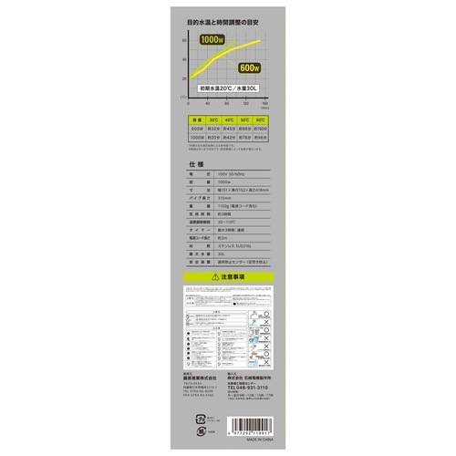 風呂の過熱用には使用しないでください。空焚きはしないでください。最低水位以下で使用しないでください。樹脂製容器では使用しないでください。使用中及び使用後はヒーターに触らないでください。また可燃物の上に置かないでください。使用中は目を離さないでください。