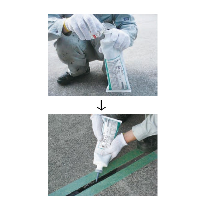 容器の先にノズルが付いていますので、目地幅やひび割れ幅にあわせて簡単に注入できます。