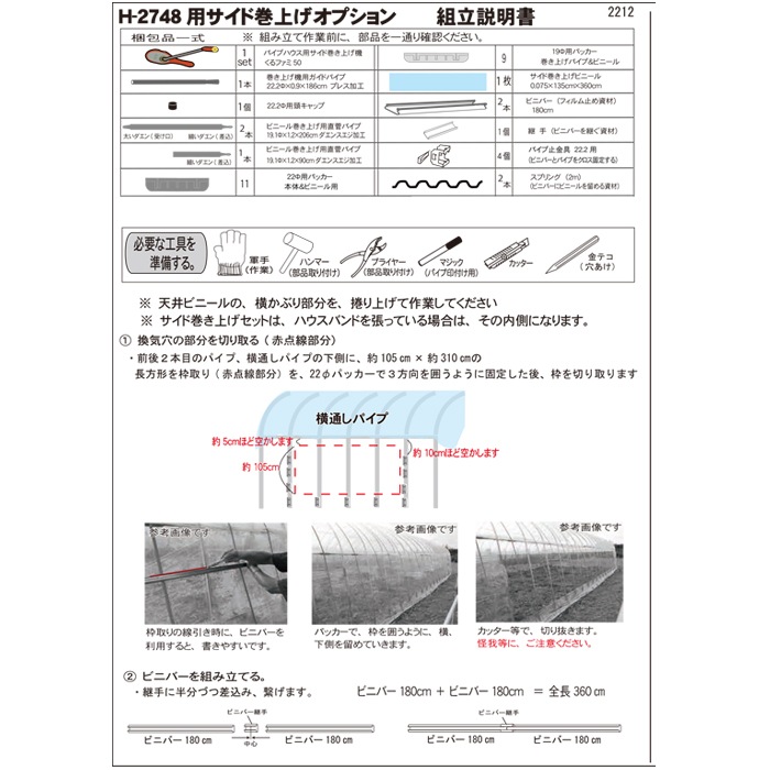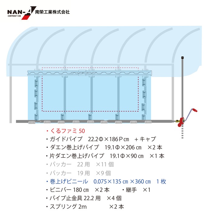 ・パイプ材質:亜鉛メッキスチールパイプ 22.2Φ 19.1Φ ・農業資材専用金具 ・ハウスビニール材質:農業用ビニール オカモトビニール製 ・ハウスビニール:天幕 側幕 扉幕 ・巻上関連:ダエンスエジパイプ、くるファミ50、金具一式、巻上ビニール |