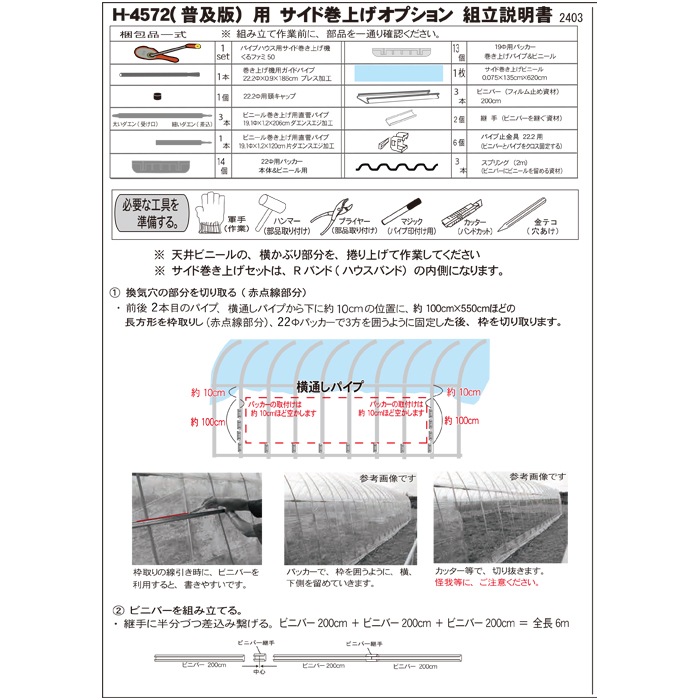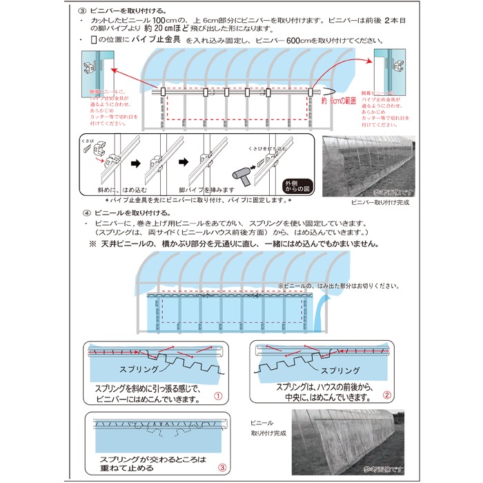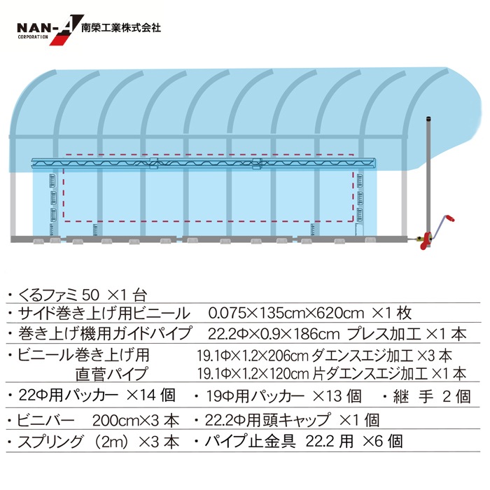 ・パイプ材質:亜鉛メッキスチールパイプ 22.2Φ 19.1Φ ・農業資材専用金具 ・ハウスビニール材質:農業用ビニール オカモトビニール製 ・ハウスビニール:天幕 側幕 扉幕 ・巻上関連:ダエンスエジパイプ、くるファミ50、金具一式、巻上ビニール |