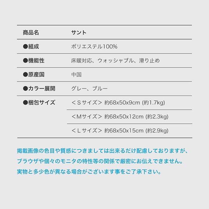 | サイズ | ●S:130×185cm ●M:185×185cm ●L:185×240cm |