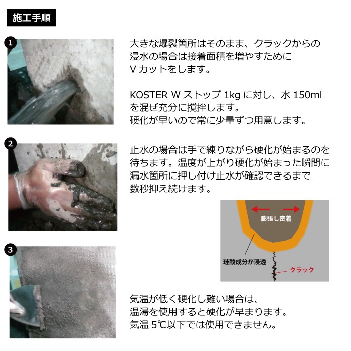 カスター Wストップ は0.5%膨張する早強性止水セメントで、